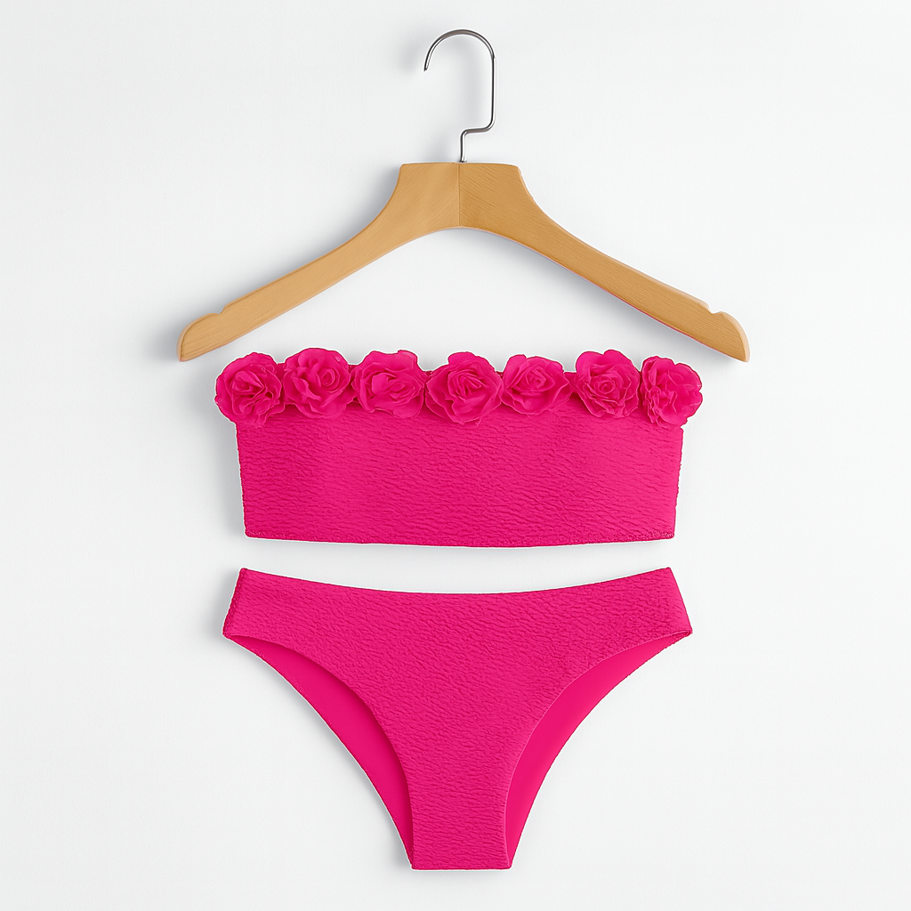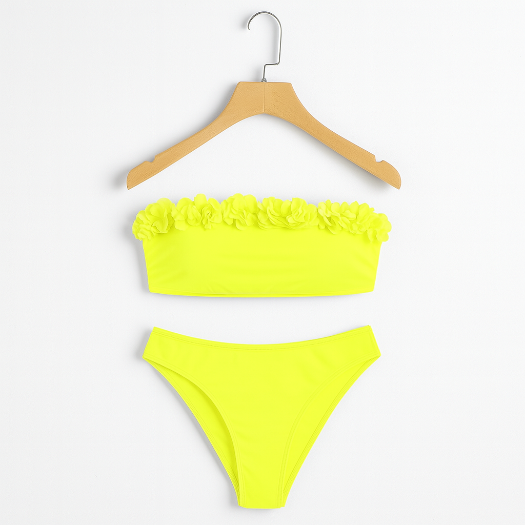 Dieser charmante Bikini für Damen überzeugt durch sein verspieltes Rüschen-Bandeau-Top und eine figurformende High-Waist-Hose.