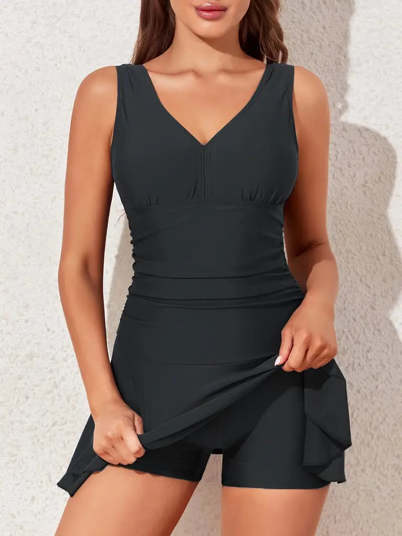 Dieses Bademode-Badeanzugkleid für Damen bietet eine feminine Optik durch seinen tiefen V-Ausschnitt und die leicht ausgestellte Rockform mit verspieltem Rüschenabschluss.