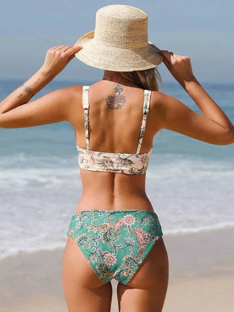 Bademode Damen Bikini Set mit floralen Blättern und Bändern
