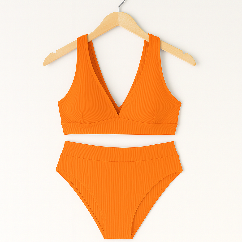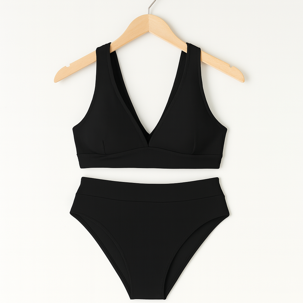 Dieses Bademode-Bikini-Set für Damen kombiniert einen modernen V-Ausschnitt mit einer hoch geschnittenen Bikinihose, die den Körper vorteilhaft formt.