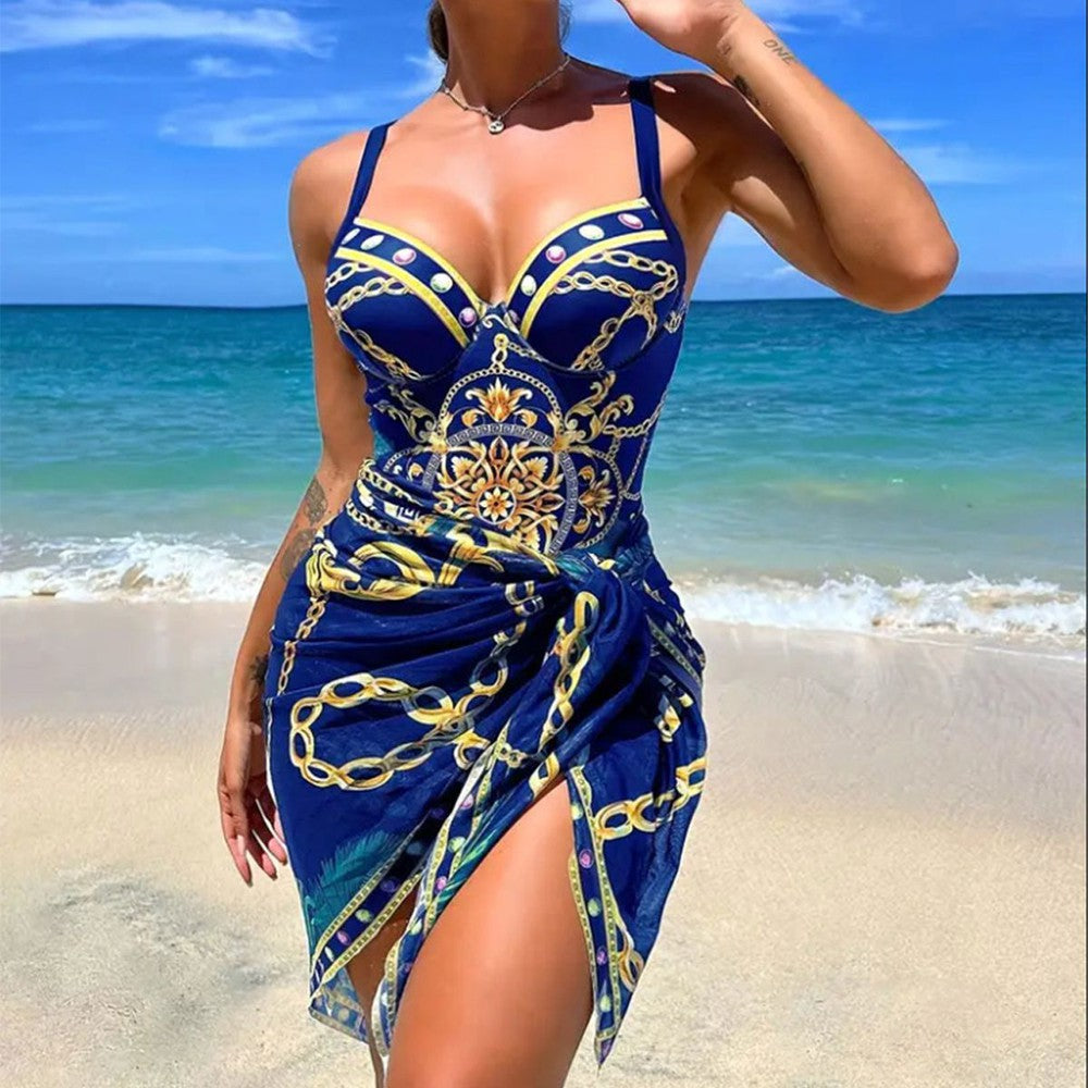 Dieses stilvolle Bademoden-Set in kräftigem Blau vereint einen eleganten Einteiler mit einem passenden Wickeltuch.