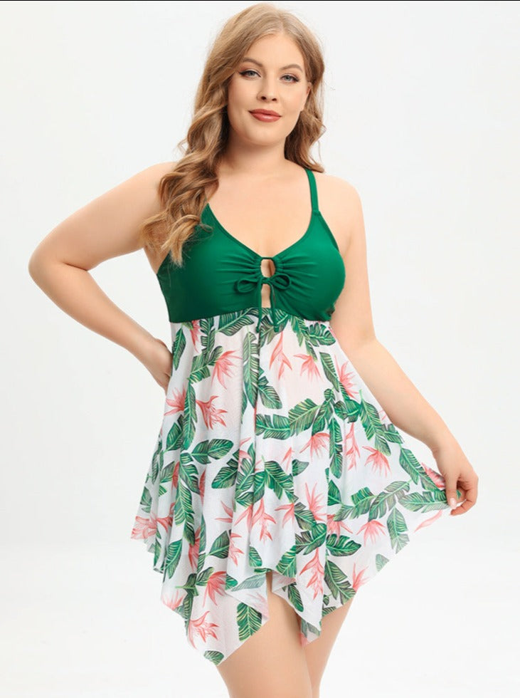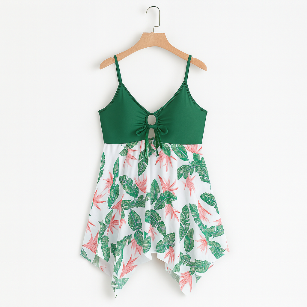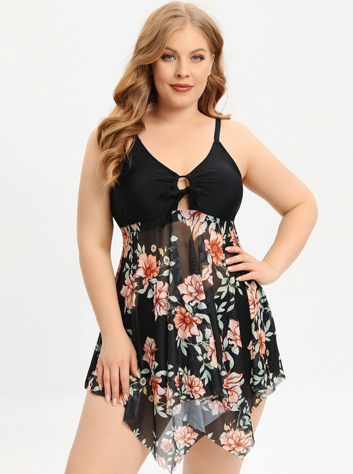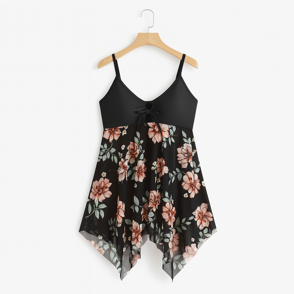 Dieser stilvolle Bademode-Overall im Kleid-Stil kombiniert romantisches Blumenmuster mit einem lockeren, fließenden Schnitt, der die Figur sanft umspielt.