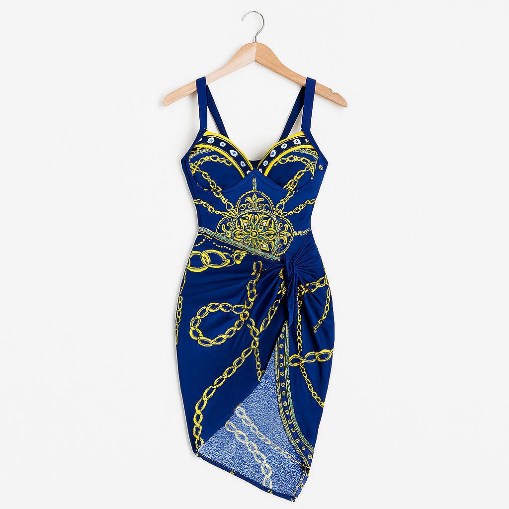 Dieser Badeanzug im königsblauen Farbton mit auffälligem Kettenmuster sorgt für einen stilvollen Auftritt am Strand oder Pool.