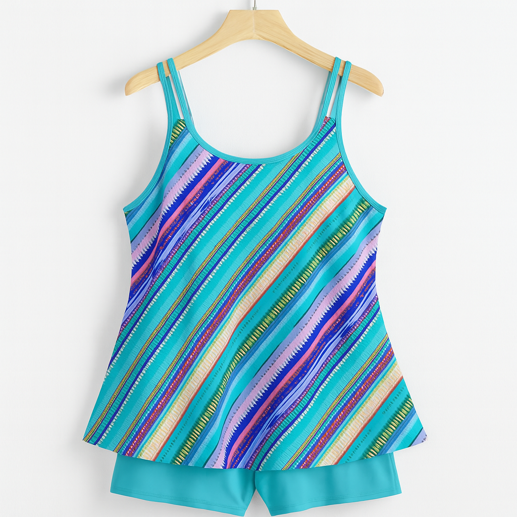 Der bequeme Tankini-Stil bietet eine legere Silhouette, während die Shorts optimalen Halt und Bewegungsfreiheit garantieren – ideal für einen aktiven Strandtag oder entspannte Stunden am Wasser.