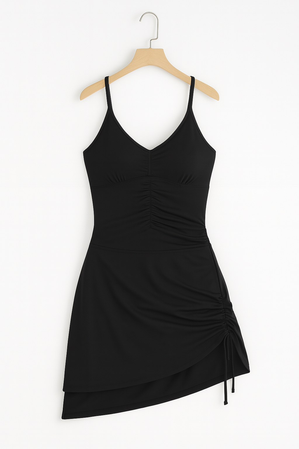 Diese Bademode vereint klare Linien und einen modernen Schnitt in einem klassischen Schwarzton. Der tiefe V-Ausschnitt betont stilvoll das Dekolleté, während der seitliche, verstellbare Saum einen Hauch verspielter Raffinesse hinzufügt. Die figurbetonte Passform bietet einen femininen Look, ohne auf Komfort zu verzichten – ideal für entspannte Strandtage oder aktive Stunden am Pool.