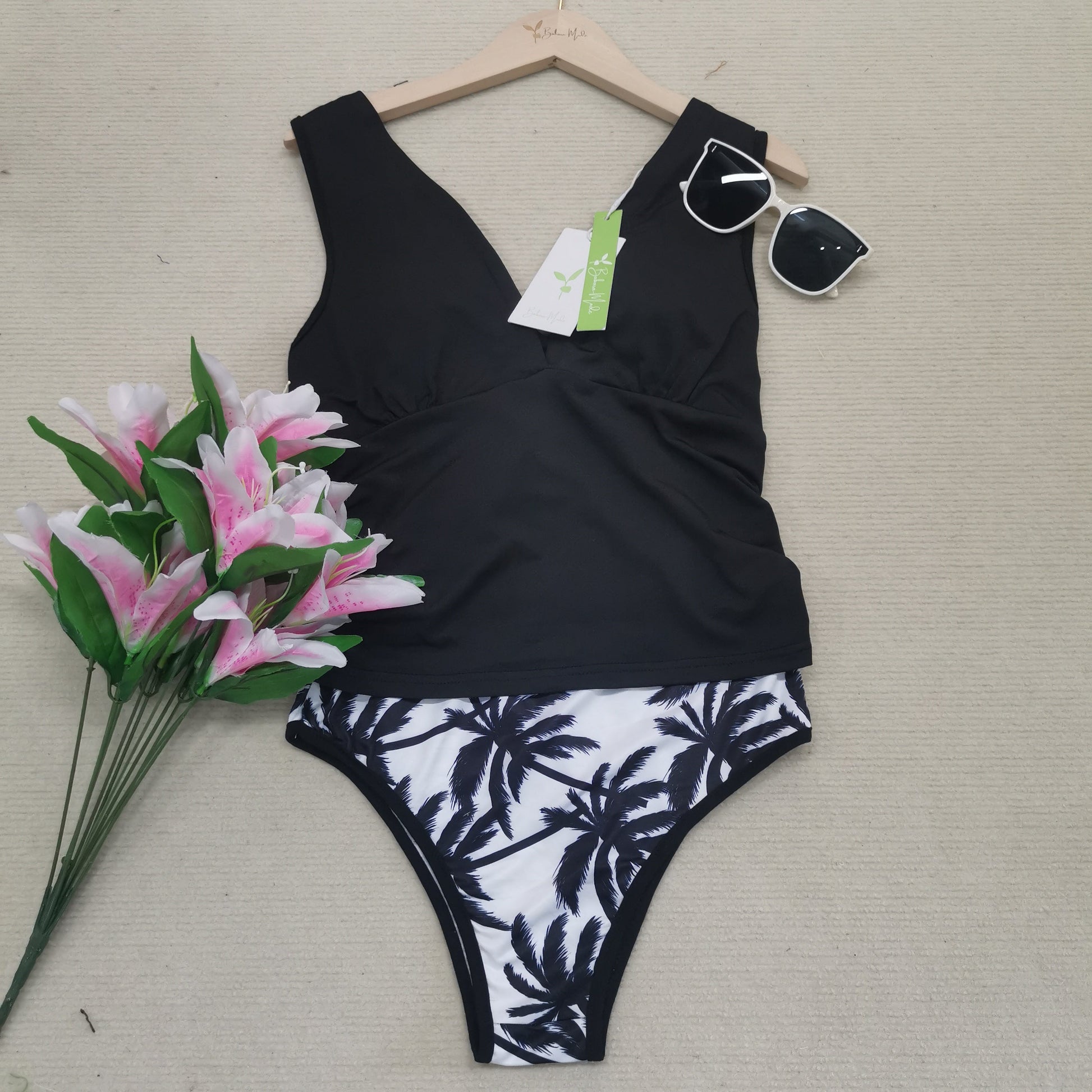 Dieses stilvolle zweiteilige Bademoden-Set überzeugt mit einem tiefen V-Ausschnitt-Top in klassischem Schwarz und einer gemusterten Bikinihose mit Palmenmotiv.