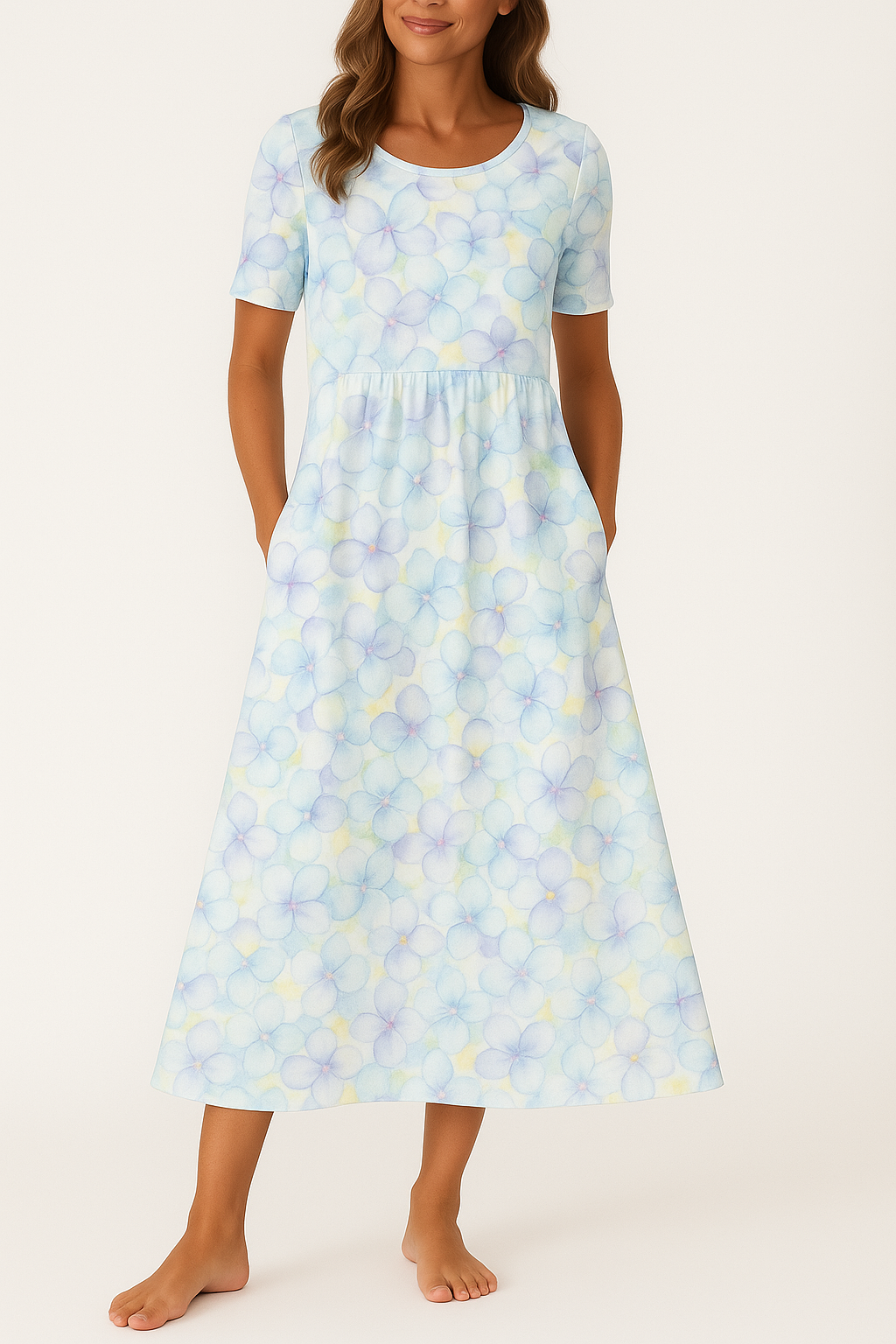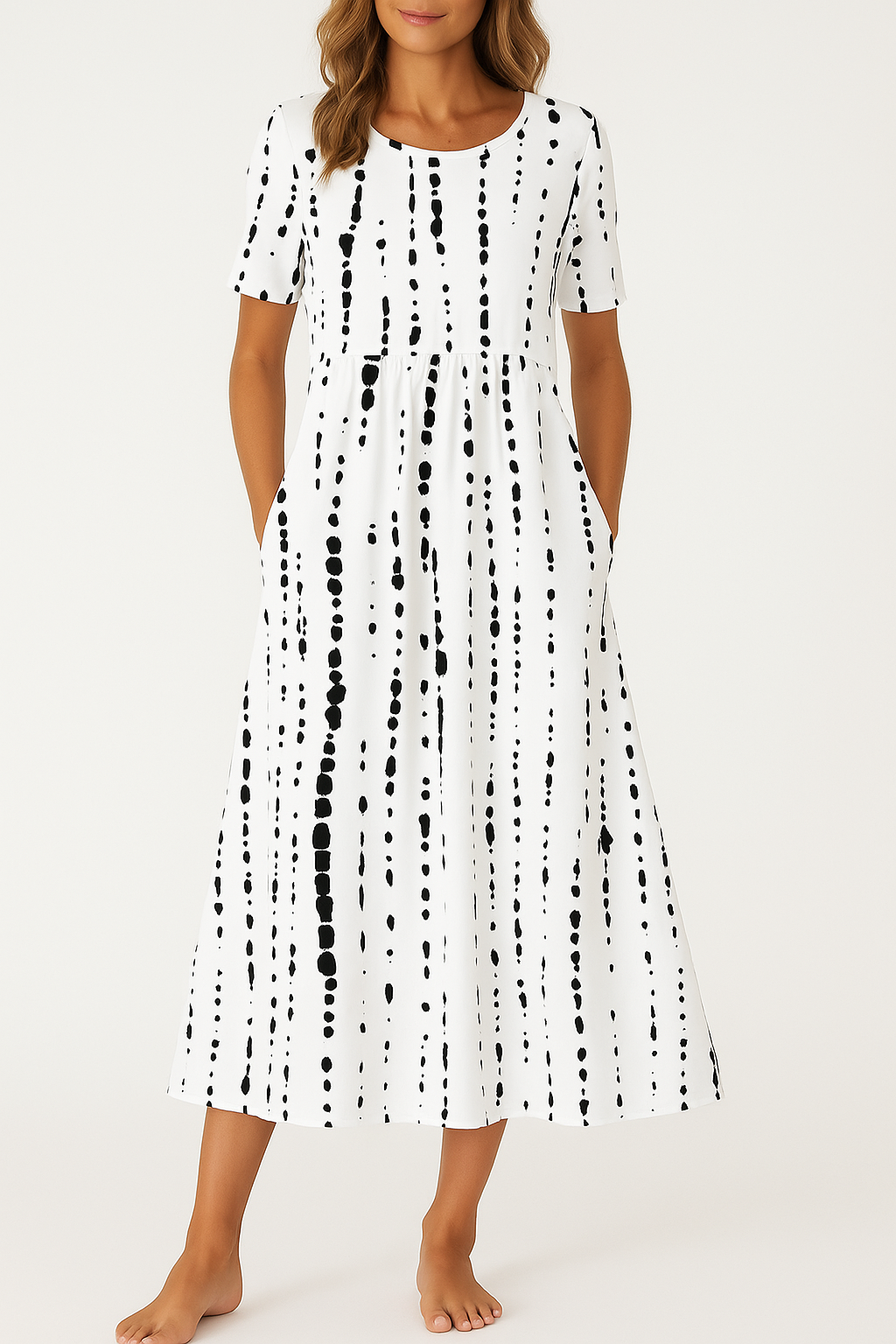 Der lockere Schnitt und die kurzen Ärmel verleihen Ihnen einen entspannten Look, ideal für sonnige Tage und entspannte Sommerabende. Dieses Kleid kombiniert mühelos Eleganz und Bequemlichkeit, sodass Sie sich bei jeder Gelegenheit großartig fühlen können.