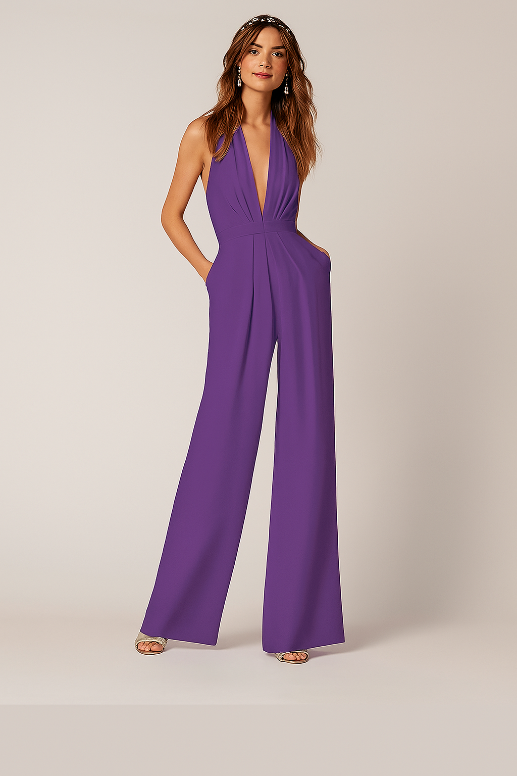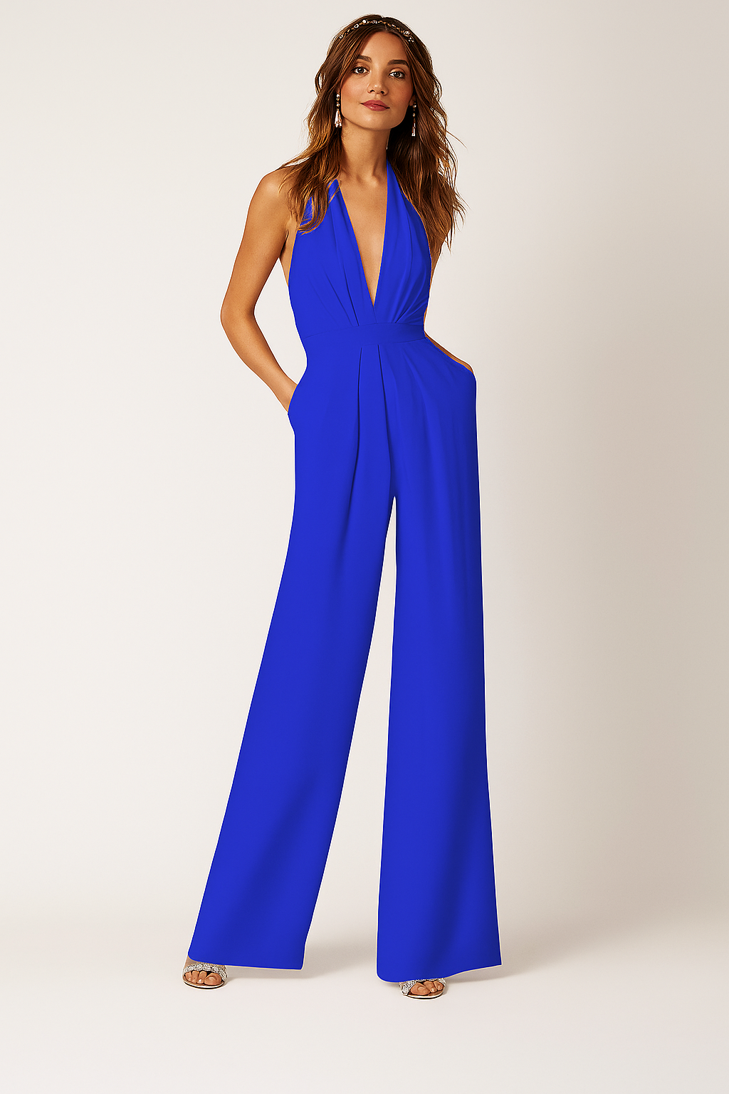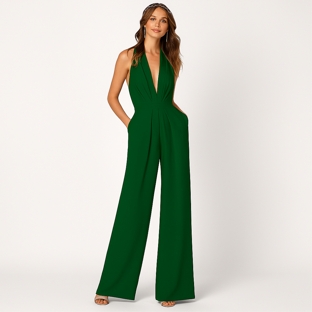 Damen Jumpsuit mit tiefem V-Ausschnitt, ärmellos, plissiert, hohe Taille, lange Hose, einfarbig