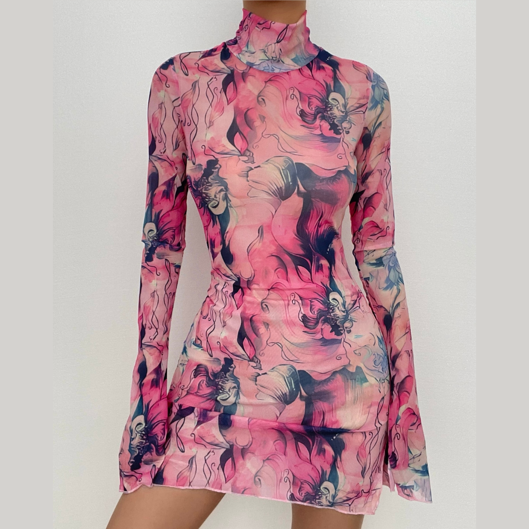 Dieses Kleid vereint modernen Chic mit verführerischem Stil und ist ideal für besondere Anlässe oder abendliche Events. Der feine Netzstoff sorgt für eine leichte und angenehme Trageweise, während der Rollkragen für zusätzliche Wärme und Stil sorgt.