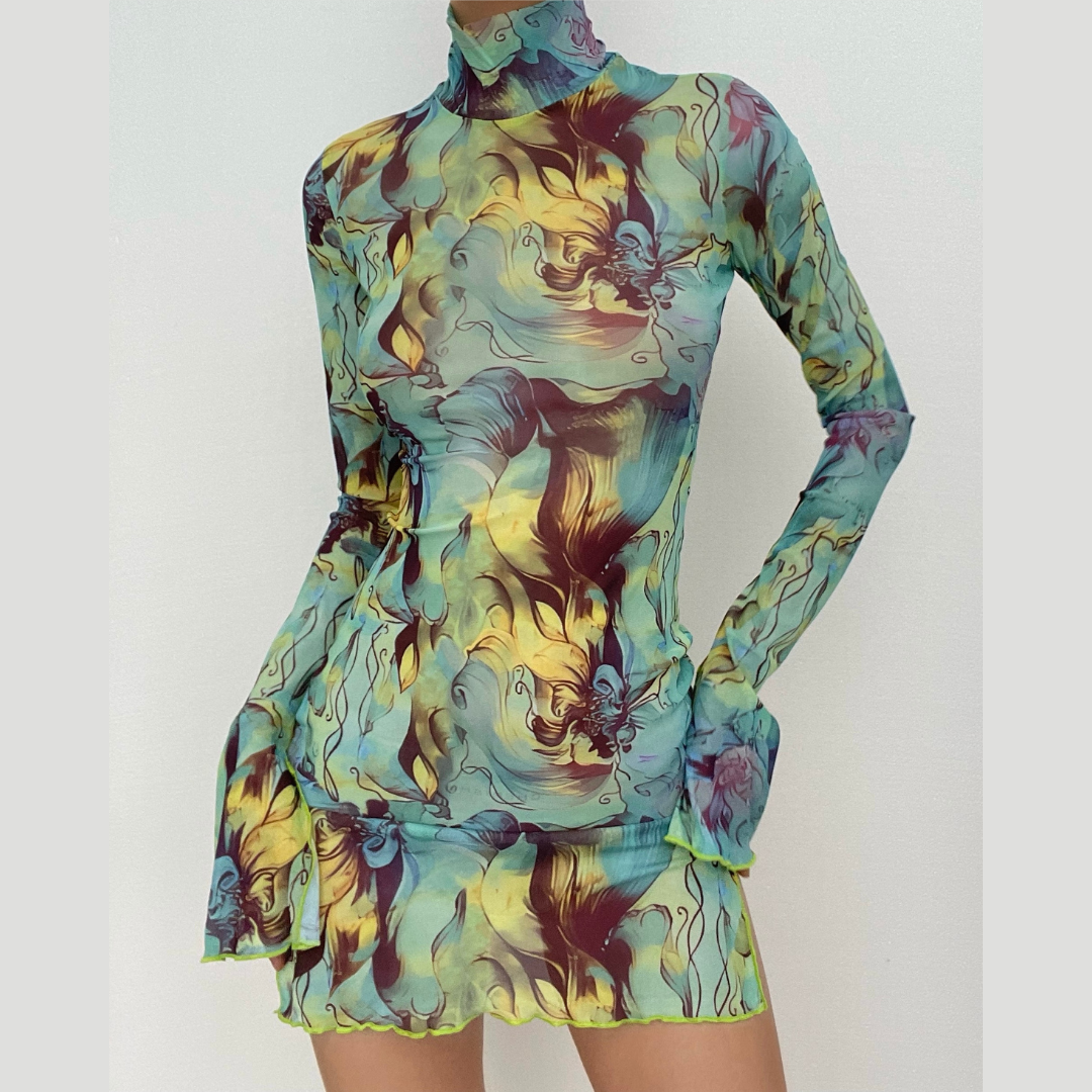 Entdecken Sie das faszinierende Netzstoffkleid, das durch seinen einzigartigen Rollkragen und den seitlichen Schlitz einen Hauch von Eleganz und Raffinesse versprüht.
