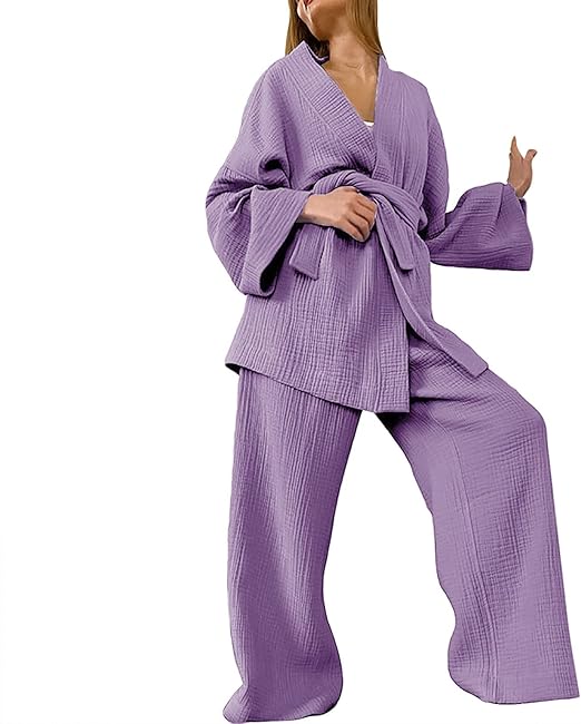 Dieses stilvolle Set besteht aus einem langärmligen Oberteil in einem edlen Violett-Ton und locker geschnittenen Hosen, die für ultimativen Tragekomfort sorgen.
