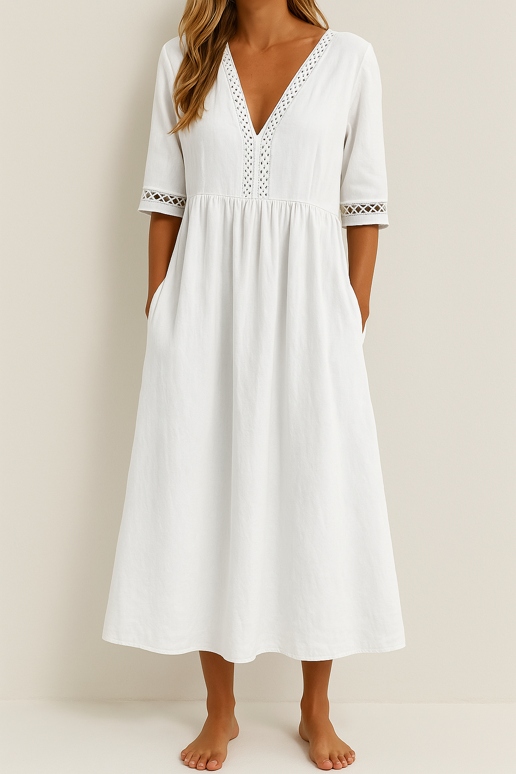 Ob am Strand, bei einem Spaziergang oder einem Treffen mit Freunden – dieses Kleid ist vielseitig einsetzbar und kombiniert Stil mit Funktionalität. Die halblangen Ärmel und die feinen Details machen es zu einem echten Hingucker, während praktische Taschen den Look abrunden und das Kleid alltagstauglich machen.