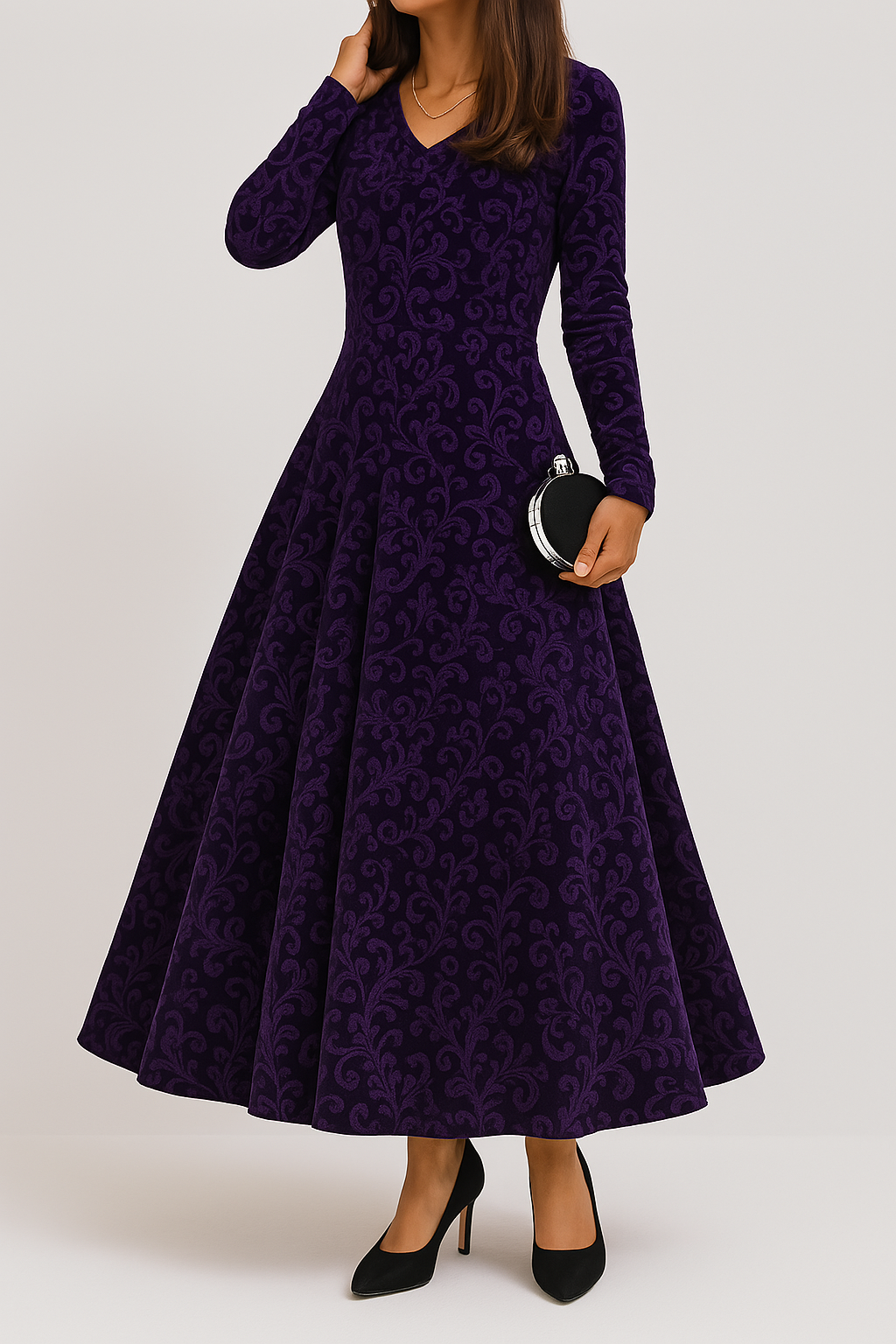 Ein elegantes Kleid für Damen mit schmeichelhaftem V-Ausschnitt, das durch seinen femininen Empire-Taille-Schnitt und die fließende Maxi-Länge begeistert.