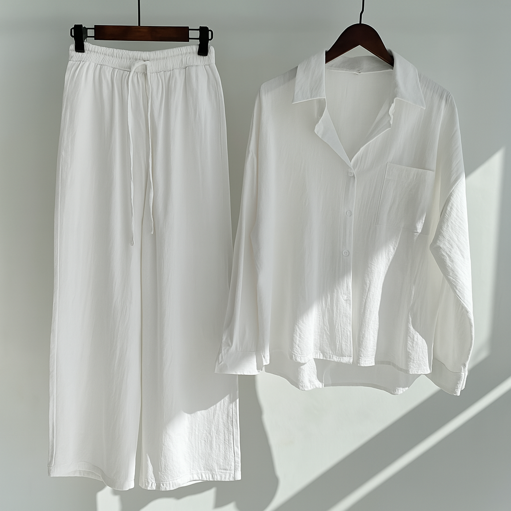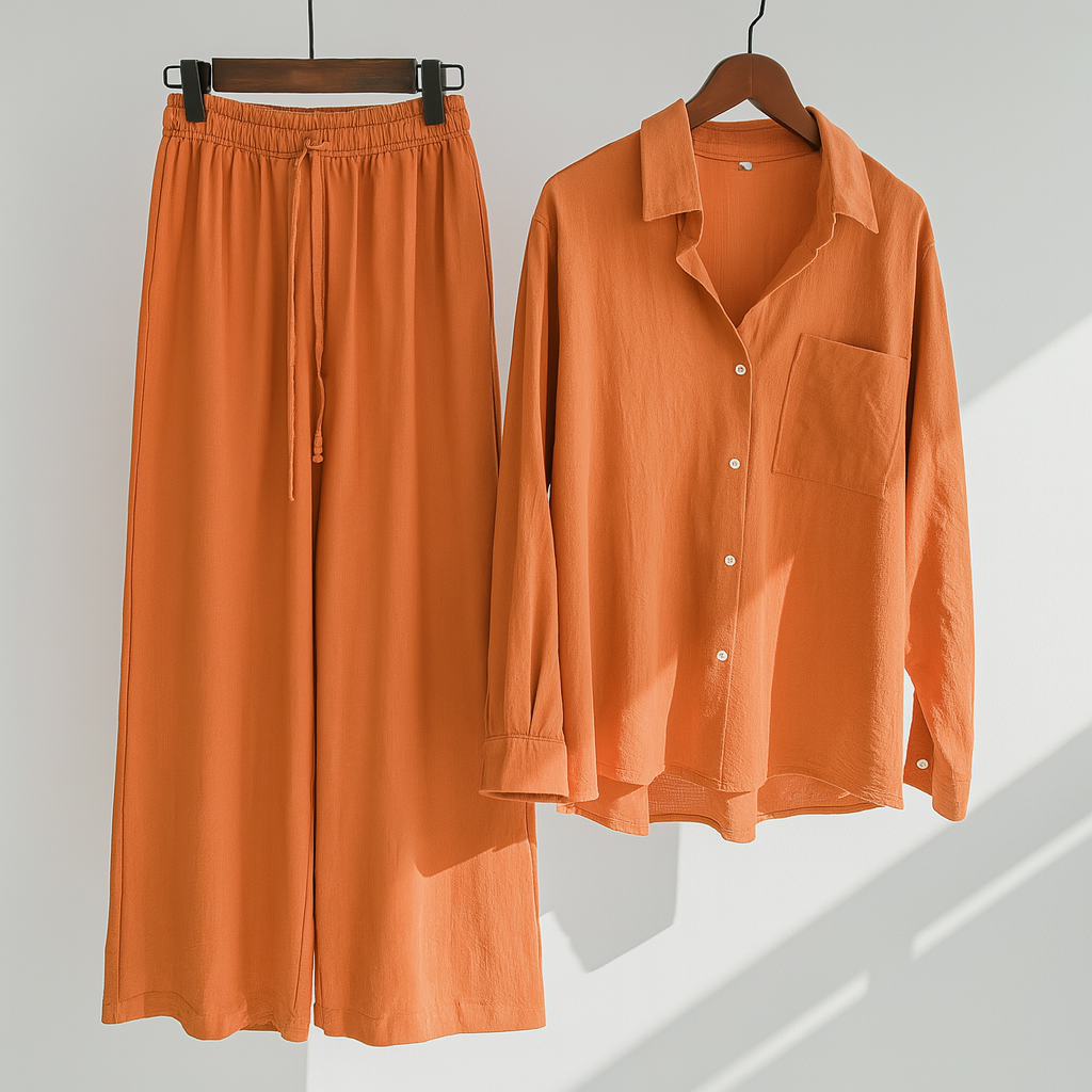 Das hochwertige Leinenmaterial ist atmungsaktiv und angenehm auf der Haut, ideal für warme Tage oder entspannte Stunden zu Hause. Ob als stilvolles Loungewear-Set oder elegantes Outfit für unterwegs – dieses Set vereint Funktionalität und modische Vielseitigkeit.