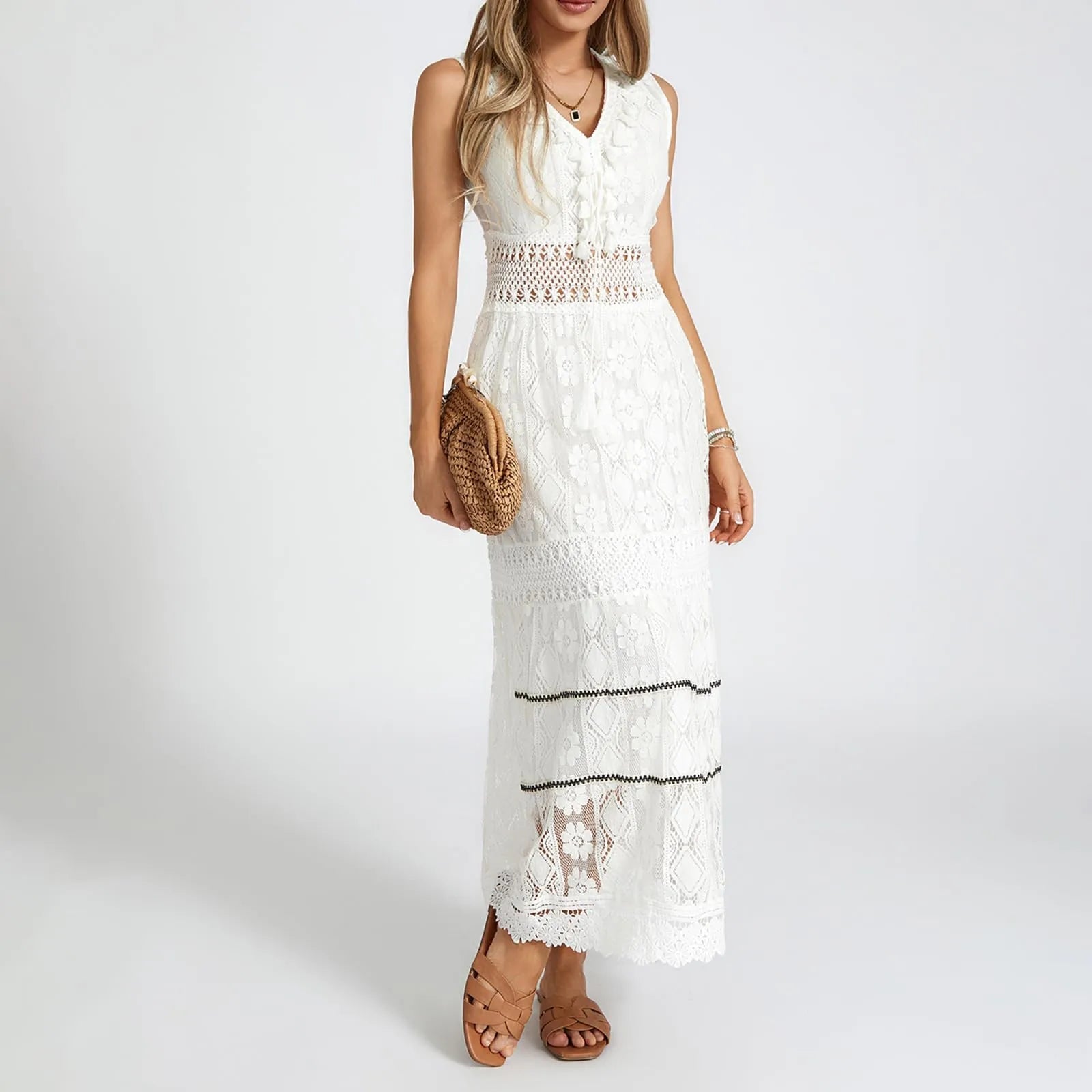 Das fein gearbeitete Spitzenmuster und die langen, fließenden Linien sorgen für einen femininen und stilvollen Look. Dank des ärmellosen Designs bleibt das Kleid angenehm luftig und eignet sich perfekt für warme Tage oder besondere Anlässe mit Boho-Charme.