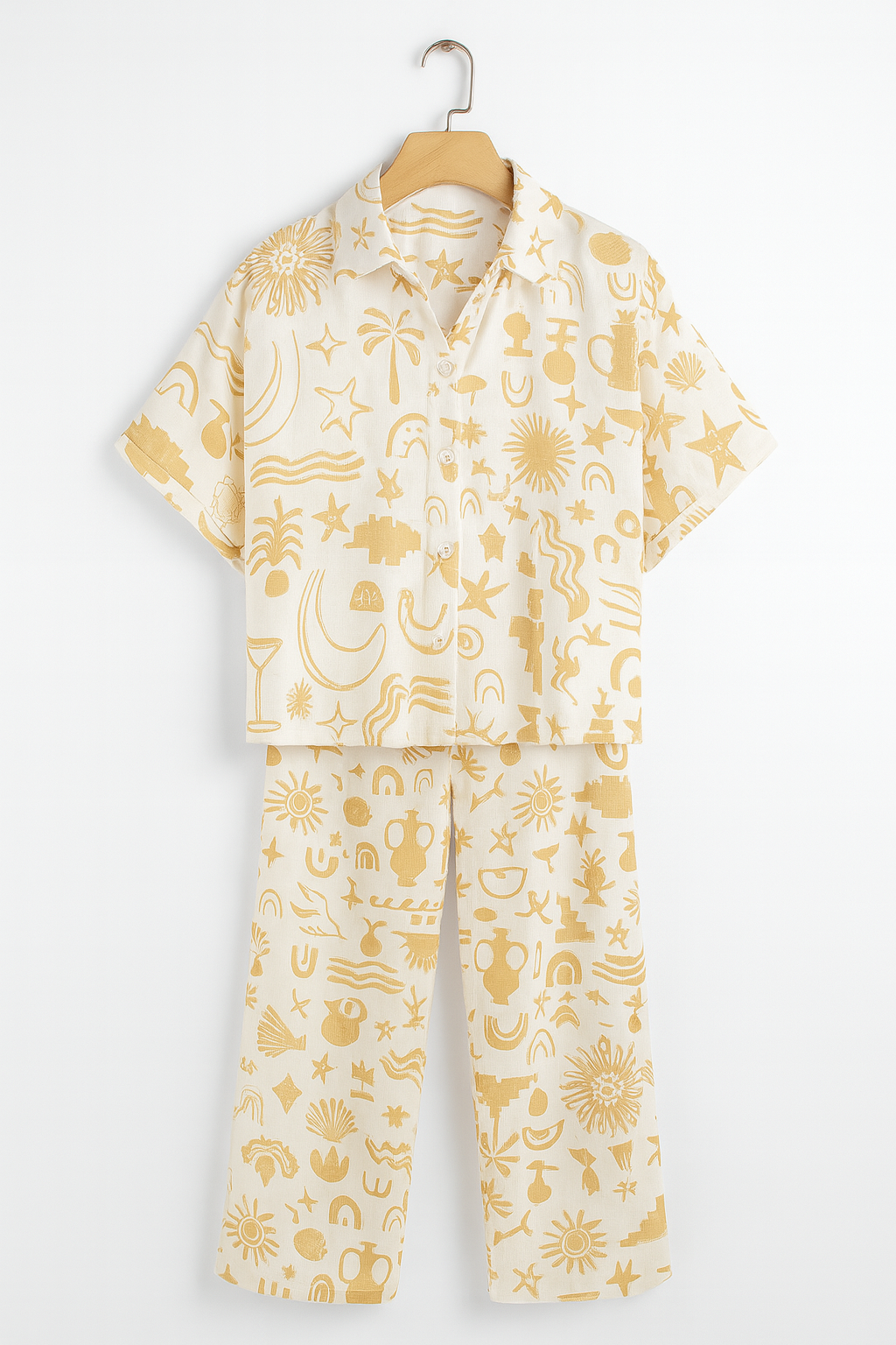 Der leichte Stoff sorgt für optimalen Tragekomfort, während das moderne Design mit dezenten Prints das Outfit zu einem echten Hingucker macht. Dieses Set ist ideal für warme Sommertage oder entspannte Abende, an denen man stilvoll, aber dennoch bequem auftreten möchte.